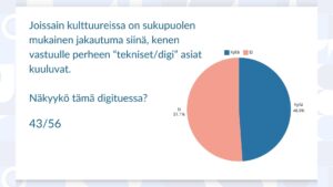 Olemme havaintotasolla huomanneet, että joissain kulttuureissa on erilaisia sukupuolirooleja siitä, kenelle tekniset ja digitaaliset asiat perheessä kuuluvat. Noin 50 % vastanneiden keskuudessa on huomattu tilanne, jossa joko mies tai nainen hoitaa perheen teknisiä asioita, vaikka nämä asiat voisivat koskea myös muita perheenjäseniä. Vastauksista käy ilmi, että useimmiten mies toimii perheen digiasioiden hoitajana, mutta myös naisia nähdään hoitamassa digiasioita itse. Digituessa pyritään kuitenkin rohkaisemaan molempia puolisoita osallistumaan omien asioidensa hoitoon.